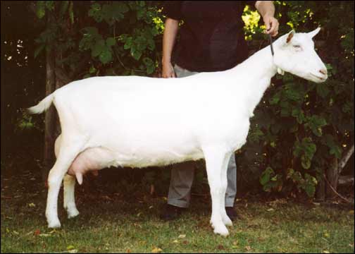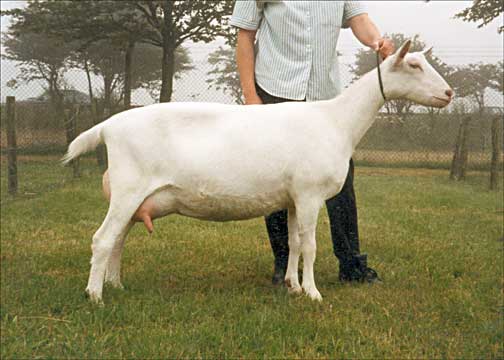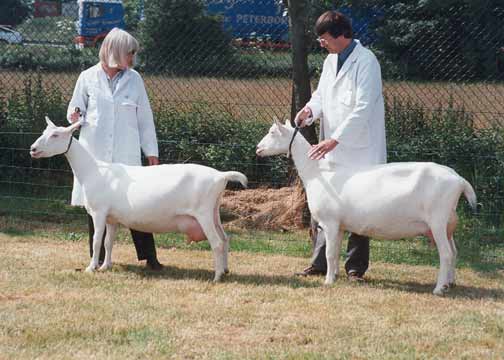 Mollie was the bridesmaid of the Toddbrook Herd - for many years - gaining 2 Reserve CCs, 3 BCC's and 14 Reserve BCC's only being beaten generally by one of her stablemates. Her worth to the herd cannot be overestimated though as she was a wonderful milker, especially during the winter months. A big, rangy goat with a well stuck on udder and good feet, her males continue to do well in commercial herds today. |